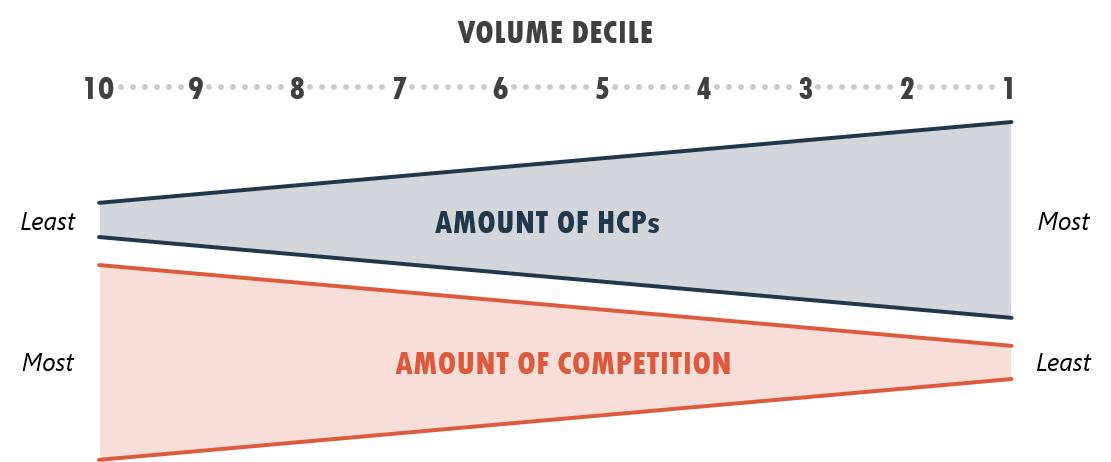 The first reason why pursuing the top volume decile HCPs has significant limitations is what is referred to in marketing as the majority fallacy, or the belief that the largest segment of a market is the best and most profitable to pursue. However, if all products in the market are chasing the largest segment of that market, then this segment consequentially becomes the most competitive. Similarly for biopharma companies, if all products in a therapeutic class are pursuing the high decile HCPs, then these HCPs become the most competitive targets.