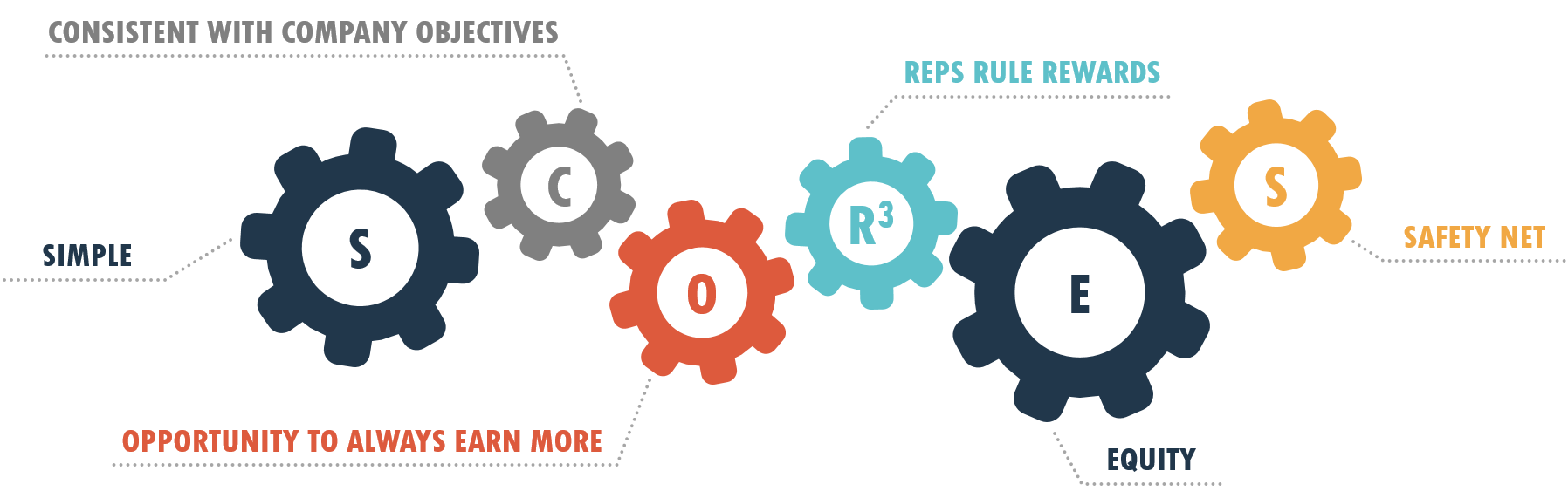 SCOR³ES® is an acronym for the six critical criteria a sales compensation plan must meet if it is to be truly effective and motivating. Each criterion is quantitatively evaluated on a scale of 1.0 to 5.0, where 3.0 is passable and any rating less than 3.0, on any criterion, means that the plan is in need of improvement and is not driving sales as well as it could be.