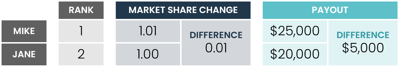 Too often, forced rank plans do not pay for performance. Consider a plan that ranks on change in market share and awards $25,000 for first place and $20,000 for second place. Mike comes in first place with a change in market share of 1.01 points; Jane comes in second place with a change in market share of 1.00 points. For a difference of one-hundredth of a share point, Jane is paid $5,000 less than Mike. Jane might feel that this isn’t fair and she would be right.