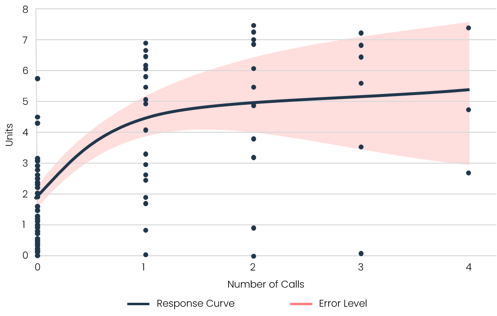 However, response curves have high amounts of statistical error because the error term expands as the number of data points decreases, meaning that the highest error is at higher call levels since the fewest calls are made at the higher call levels. Thus, the area that is most important for determining diminishing returns—and thus most important for assigning call frequency—has the highest error.