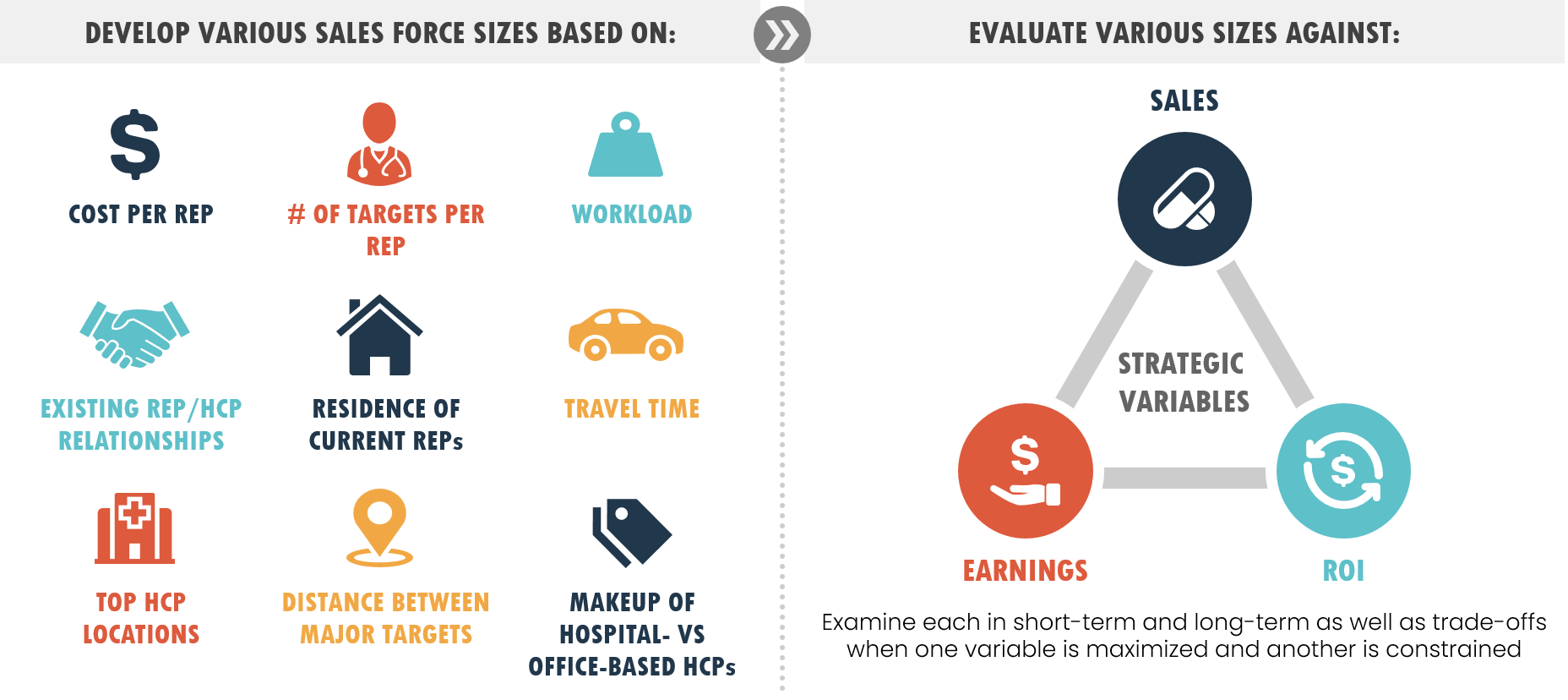Once we have determined the level of opportunity, we develop various biotech sales force size options that can cover that opportunity based on numerous factors, a number of which are exclusive to the pharma, biotech and medical device industries. Each option is examined in terms of three strategic variables—sales, earnings and ROI—and what the impact is when one variable is maximized and another is constrained.